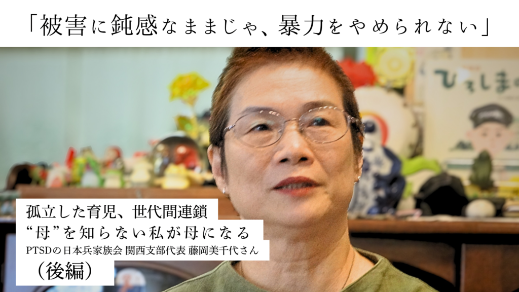 本稿では、親子二世代にわたるアルコール依存、家庭内暴力の連鎖を生き抜いてきた藤岡美千代さん(PTSDの日本兵家族会 関西支部代表)が、自身の痛みに向き合い、加害を見つめてきた半生を追っています。